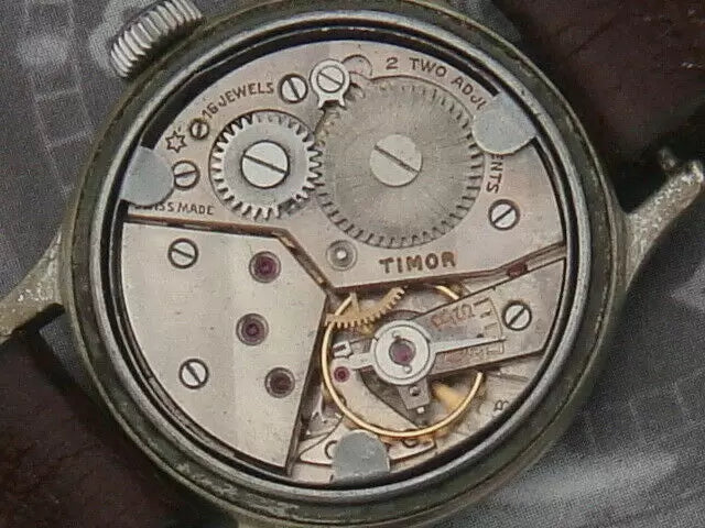 The movement can be a calibre 99, 17 jewels, with the TIMOR snail engraved, a modified ETA900 movement. Possibly associated with the case back marked 15600.