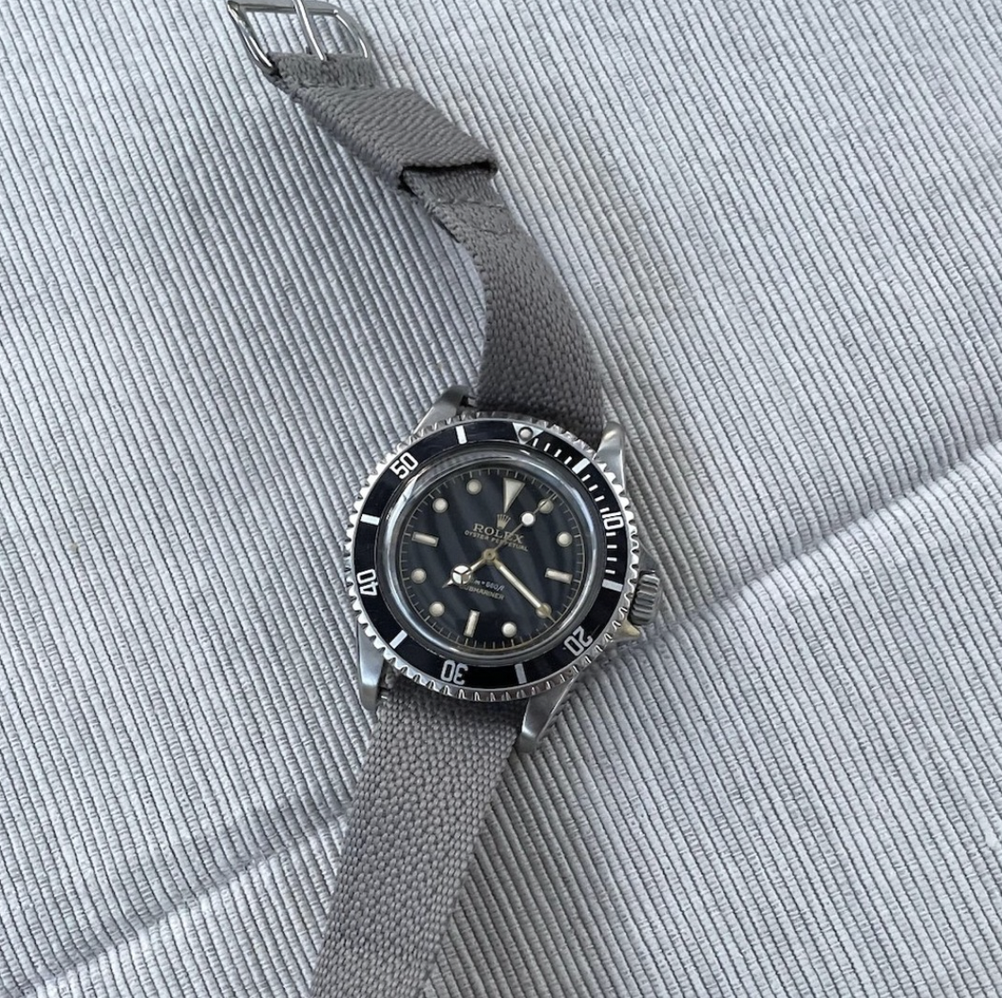 The next evolution of nylon straps was the RAF style pull through strap as shown on the Rolex Submariner ref 6538 watch of James Bond in Goldfinger in 1963. This was a 16mm wide nylon strap in the colours of the Royal Scots Regiment at the time. (The 9 stripe colour scheme is dark oxford blue, peony red and gosling green).